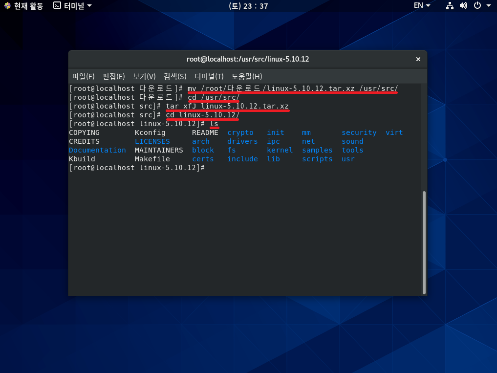 mv /root/다운로드/linux-5.10.12.tar.xz /usr/src/