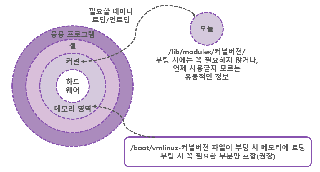 따라서 자주 사용하지 않고 가끔 사용하는 코드는 커널에 넣지 않고 별도로 보관했다가 필요할 때 호출해 사용하면 커널의 크기가 그렇게 커지지 않으면서 더 많은 하드웨어를 지원할 수 있게 되며, 이렇게 별도로 보관했다가 필요할 때마다 호출하여 사용하는 코드를 '모듈'이라고 부른다.