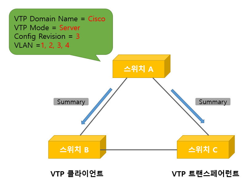 스위치 B는 VTP 클라이언트 모드로, 스위치 C는 VTP 트랜스페어런트 모드로 만들어 스위치 A와 직접 연결하면 스위치 A는 스위치 B와 스위치 C에게 Summary Advertisement를 전송한다.