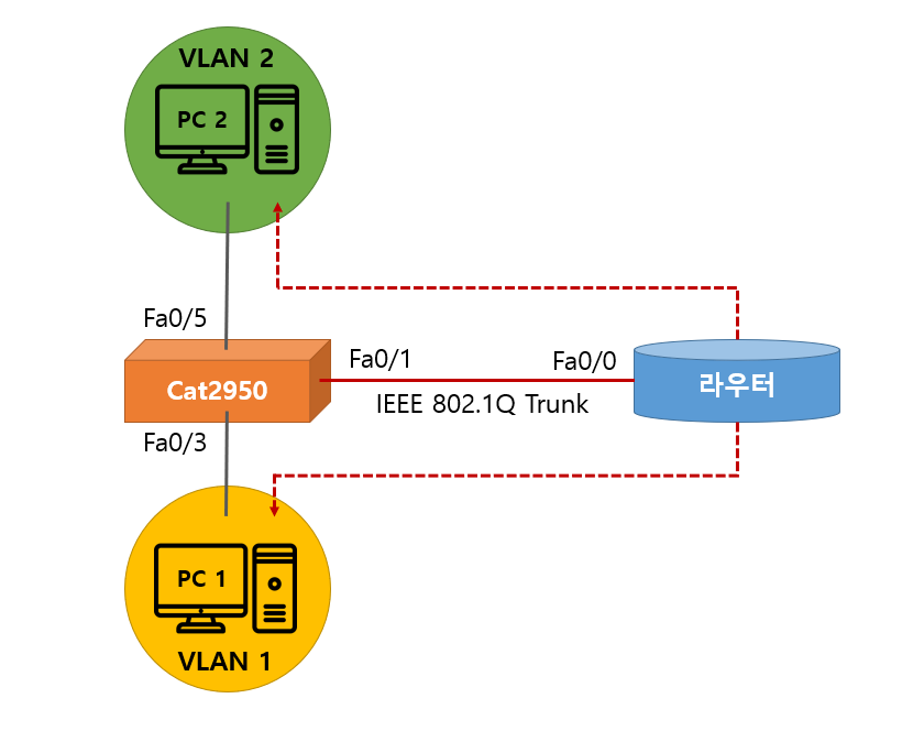 이 구성에서 PC 1과 PC 2는 서로 다른 네트워크에 있기 때문에 비록 같은 스위치에 연결되어 있더라도 직접 통신을 할 수 없고 오직 라우터를 통해서만 통신이 가능하며, 점선으로 표시된 화살표가 바로 PC 1과 PC 2가 라우터를 거쳐서 통신하는 경로다.